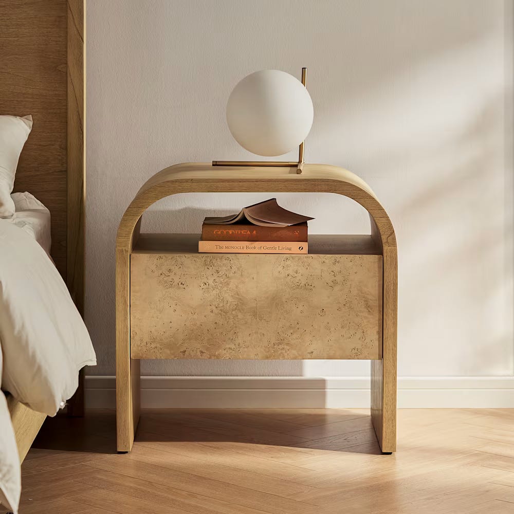 The Crescent designs are really special pieces mixing two different wood veneers including the gorgeous mappa burl. There’s the single bedside table shown above, a larger two drawer version, and an amazing six drawer side board too.